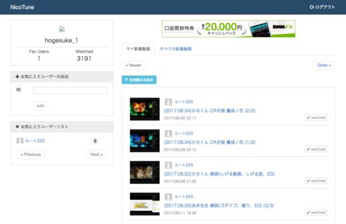 http://nicotune.net/ お気に入りのニコニコ動画投稿者の新着動画を表示してくれるサービス チューニングした 最近はNetflixにうつつを抜かして、ニコニコ動画を観なくなっていましたがPUBGプレイ動画にハマってしまいニコ厨化しつつあります。 新着動画の確…